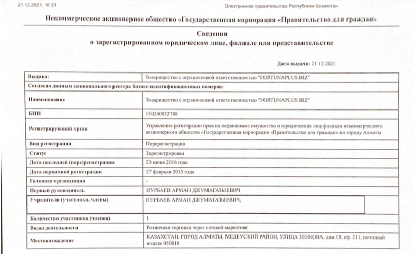 ТОО FORTUNA PLUS Была была основана группой опытных предпринимателей в 2017 году. Головной офис компании располагается по адресу Республика Казахстан город Алматы ул: Зенкова 13 офис 211.